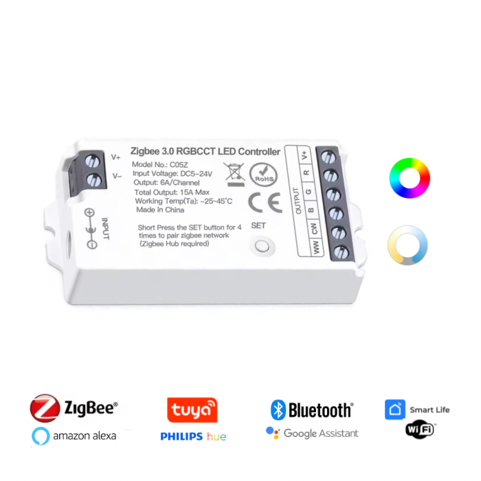 - RGBCCT = 6 vias; Controla colorido + branco quente e branco frio